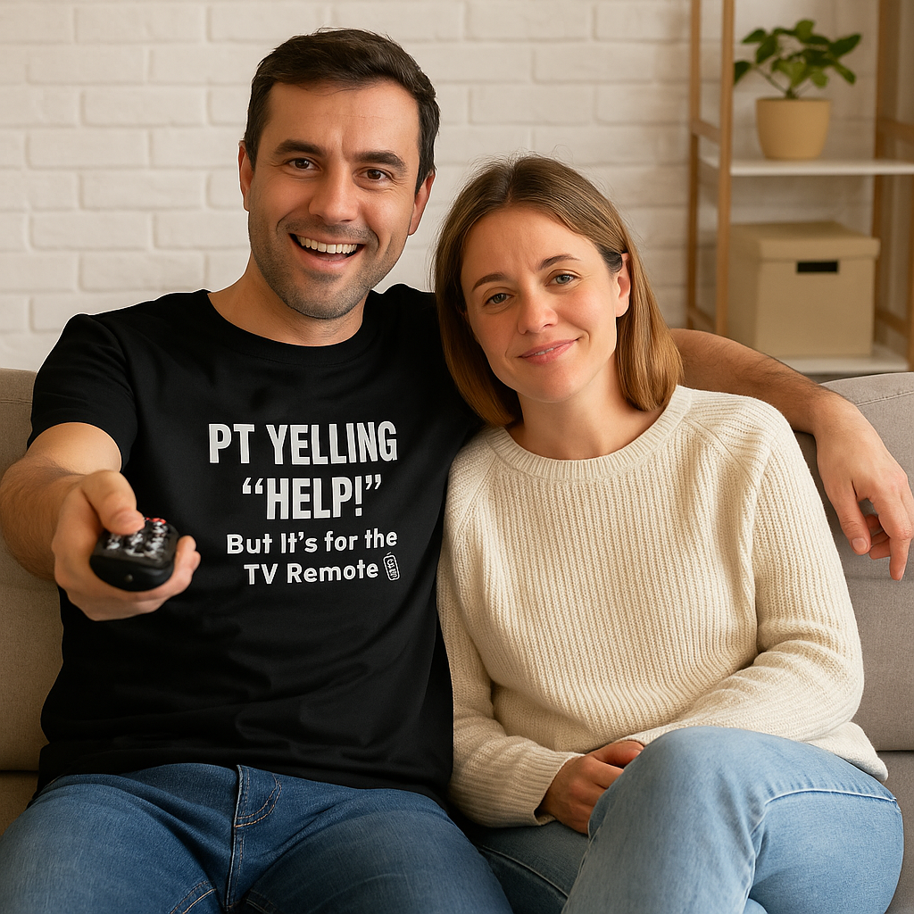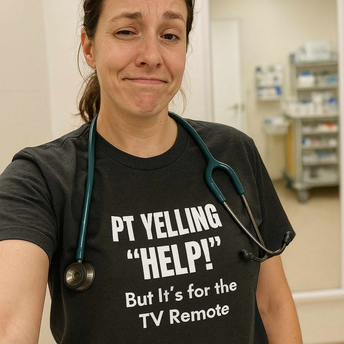 PT yells “Help!” You sprint. It’s… the TV remote. This nurse humor t-shirt salutes the meltdown moments that still make you laugh on the drive home.